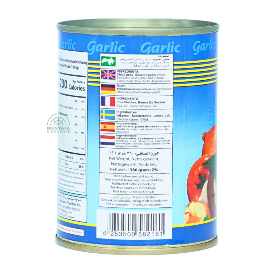 Al Bayrouty Hummus Tahini with Garlic 380g is a creamy and flavourful dip made from chickpeas, sesame tahini, and garlic. Prepared with authentic Middle Eastern recipe, this ready-to-eat hummus is perfect as a spread, dip for bread and vegetables, or accompaniment to grilled dishes. Its smooth texture and rich taste make it a versatile choice for everyday meals and gatherings.