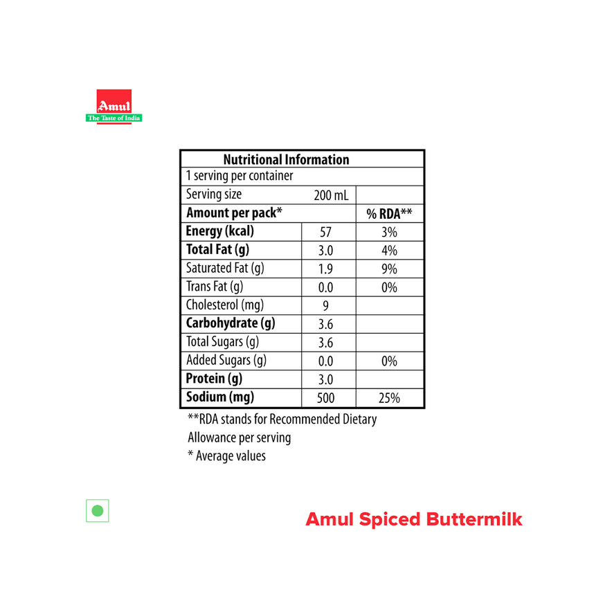 Amul Masti Spiced Buttermilk is a naturally refreshing, low-calorie milk-based drink that combines the wholesome goodness of buttermilk with a mild kick of Indian spices. It's designed to cool you off and invigorate, making it an ideal thirst-quencher for on-the-go moments, picnics, or at-home refreshment.