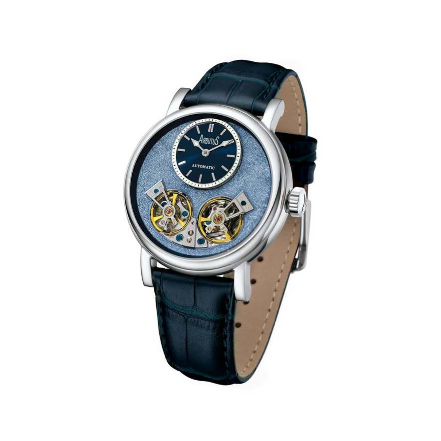 Featuring a dual balance wheel design, one functional and one decorative, this automatic masterpiece embodies Arbutus's signature fusion of horological artistry and precision. Completing the look, a blue genuine calf leather strap ensures a secure and comfortable fit, making it a timeless statement on the wrist.