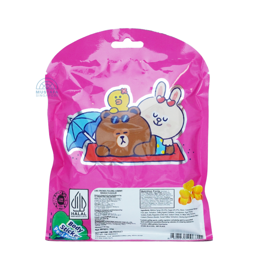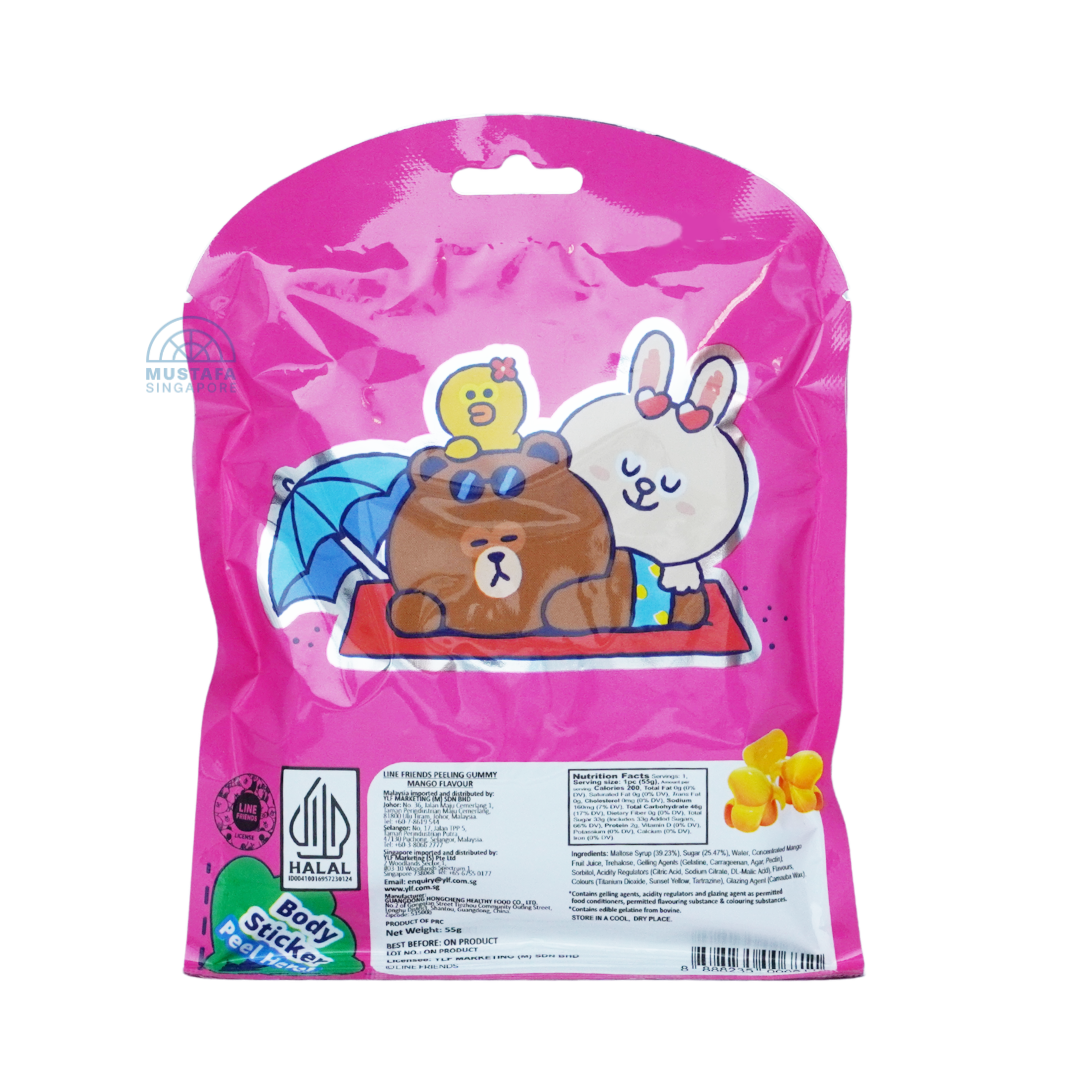 Playful peeling gummy candy with a sweet mango flavour and Line Friends design, offering a fun interactive snack experience.