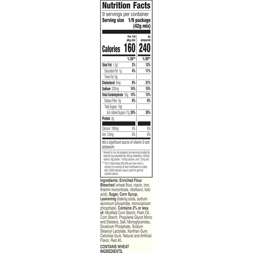 Enriched Flour Bleached (wheat flour, niacin, iron, thiamin mononitrate, riboflavin, folic acid), Sugar, Corn Syrup, Leavening (baking soda, sodium aluminum phosphate, monocalcium phosphate). Contains 2% or less of: Modified Corn Starch, Corn Starch, Propylene Glycol Mono and Diesters, Salt, Monoglycerides, Palm Oil, Dicalcium Phosphate, Sodium Stearoyl Lactylate, Xanthan Gum, Cellulose Gum, Natural and Artificial Flavor, Red 40.