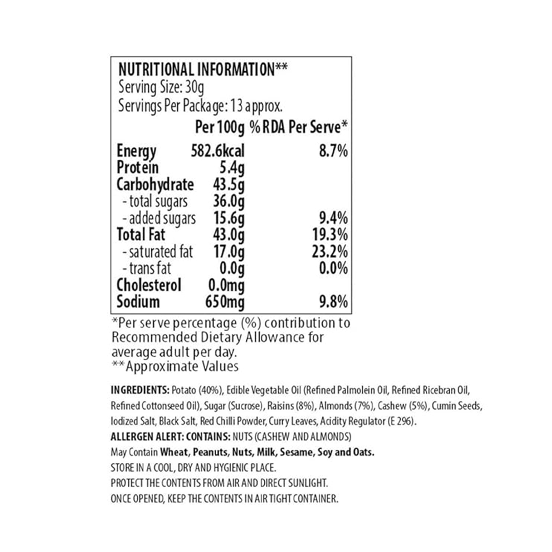 Gram Flour (Chickpea Flour), Edible Vegetable Oil (Palmolein), Almonds, Salt, Spices and Condiments