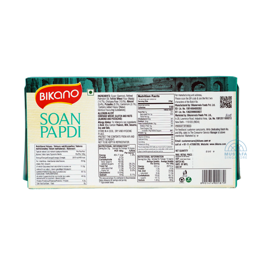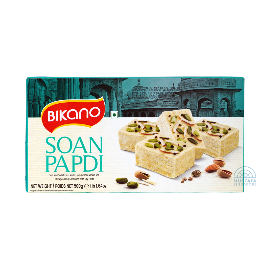 Bikano Soan Papdi is a traditional Indian sweet made from gram flour, ghee, and sugar with a light, flaky texture. It is commonly enjoyed during festivals and celebrations.