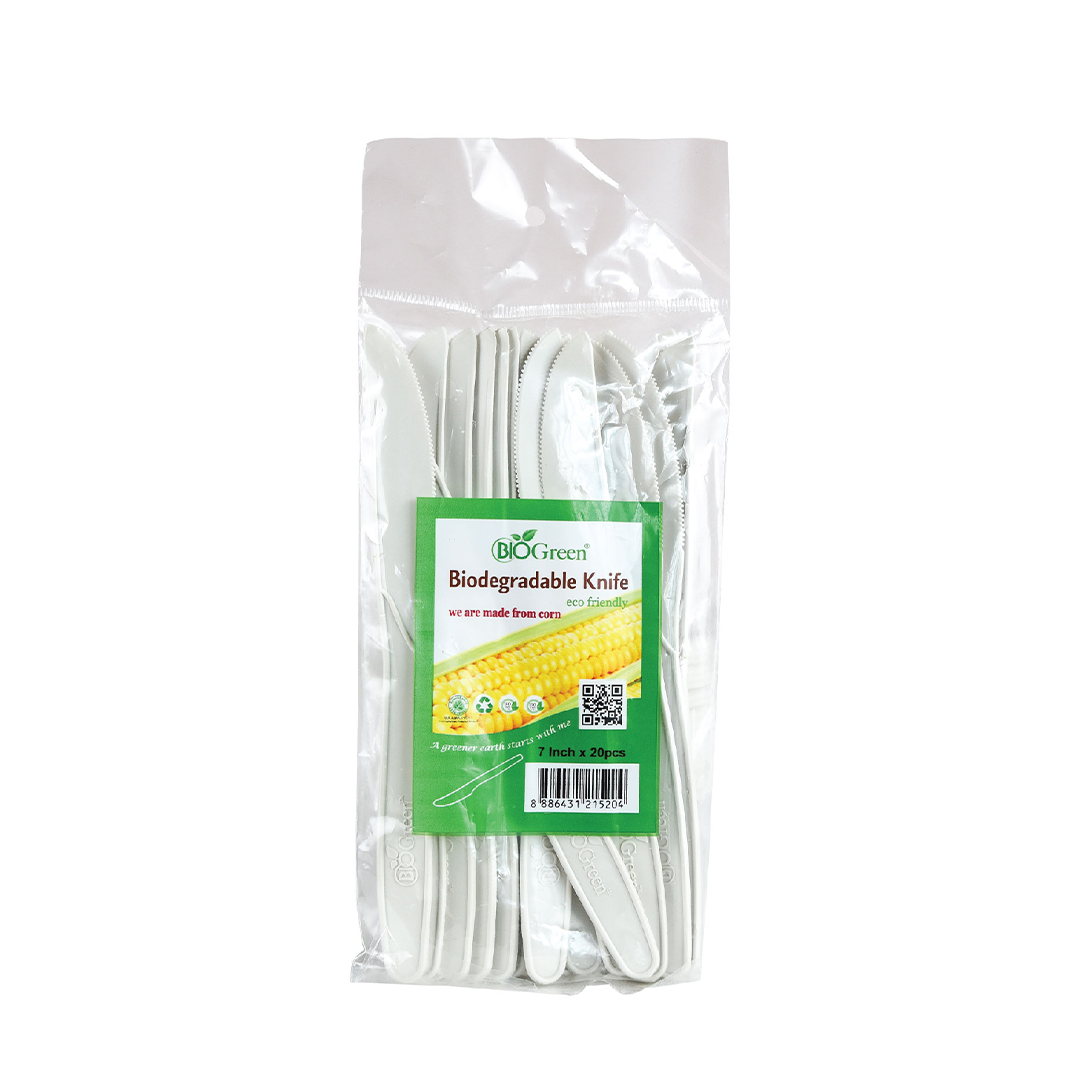 Biogreen 7-inch knives are biodegradable and made from cornstarch, combining strength and sustainability. Perfect for cutting through light meals while reducing plastic waste.