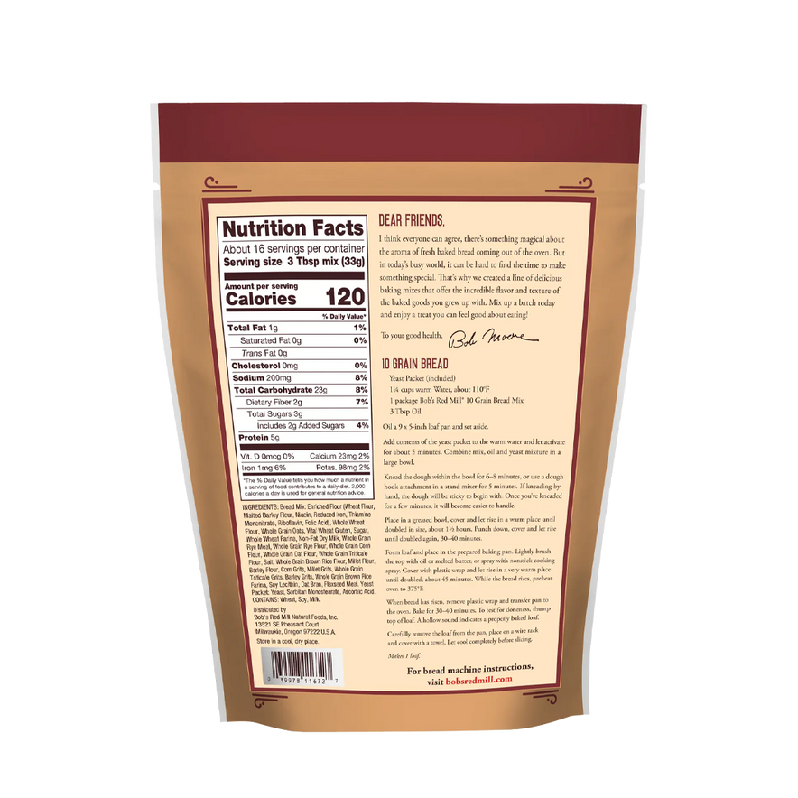 Wholesome, Nutty & Easy to Bake Our 10 Grain Bread Mix could be the best multi-grain bread you’ve ever made! With a mild, nutty flavour, it’s perfect for sandwiches, French toast, or simply enjoyed warm with butter. The dough is easy to prepare by hand, in a stand mixer, or with a bread machine. Each pack includes a yeast packet and makes one hearty 1½ lb loaf. Just add water and oil, place in a loaf pan, and bake for fresh, homemade bread every time.