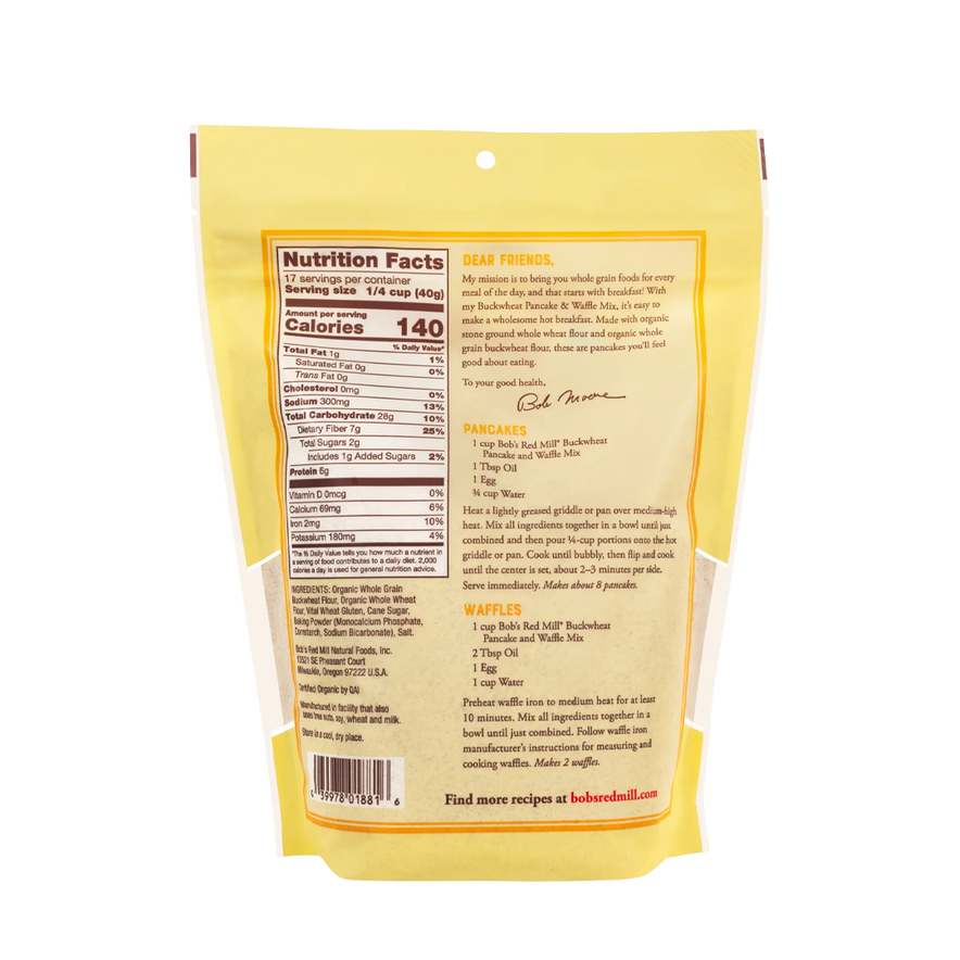Bob’s Red Mill Buckwheat Pancake & Waffle Mix is crafted from the finest stone-ground whole grain flours, cane sugar, baking powder, and sea salt for wholesome goodness and a rich, nutty flavor. This easy-to-use mix makes light, flavorful pancakes or waffles—just add egg, water, and oil. Enjoy them sweet with butter and maple syrup, savory with bacon and a fried egg, or indulgent with chocolate syrup and whipped cream. Perfect for breakfast or brunch, it delivers fantastic texture and taste in every bite.