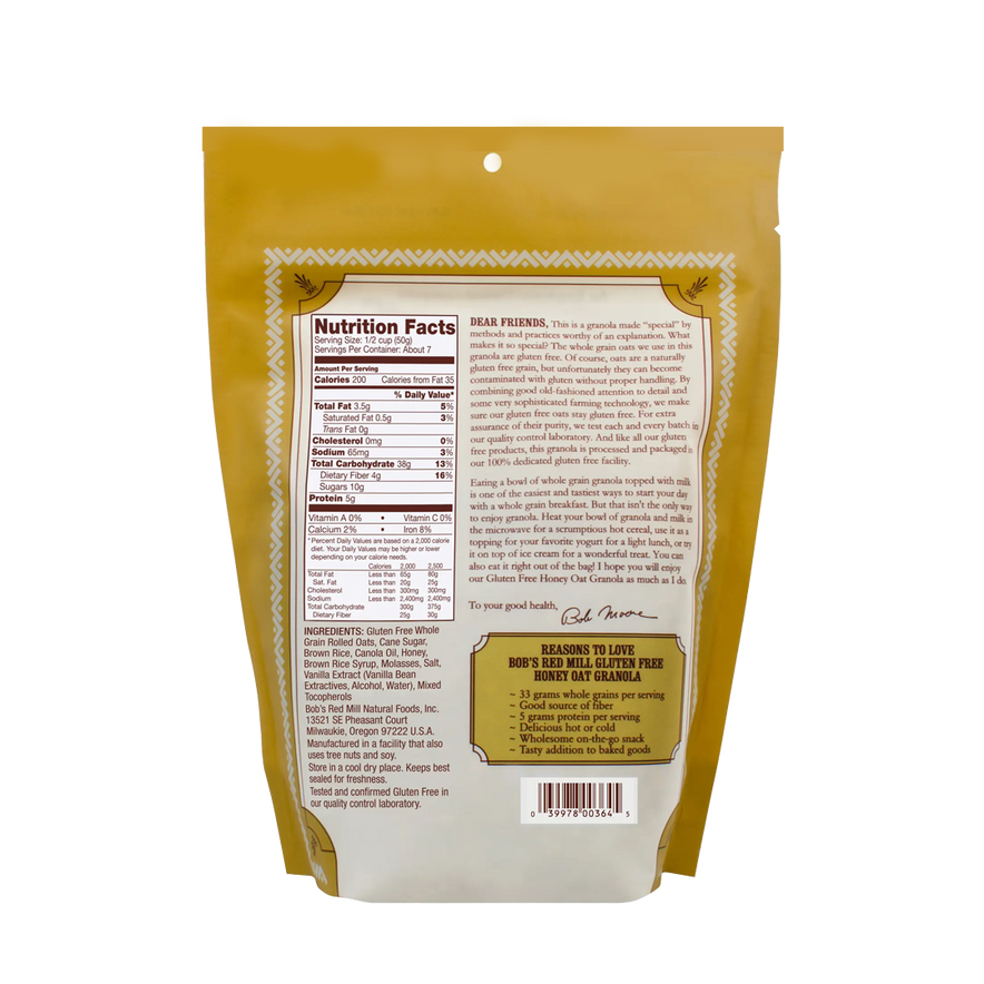 Bob’s Red Mill Gluten Free Honey Oat Granola is a crunchy, lightly sweet blend that makes enjoying a gluten free breakfast simple and delicious any day of the week. Perfect for sprinkling over Greek yogurt, topping with peanut butter, or enjoying by the handful, its golden clusters offer wholesome flavor and texture that will keep you coming back for more.