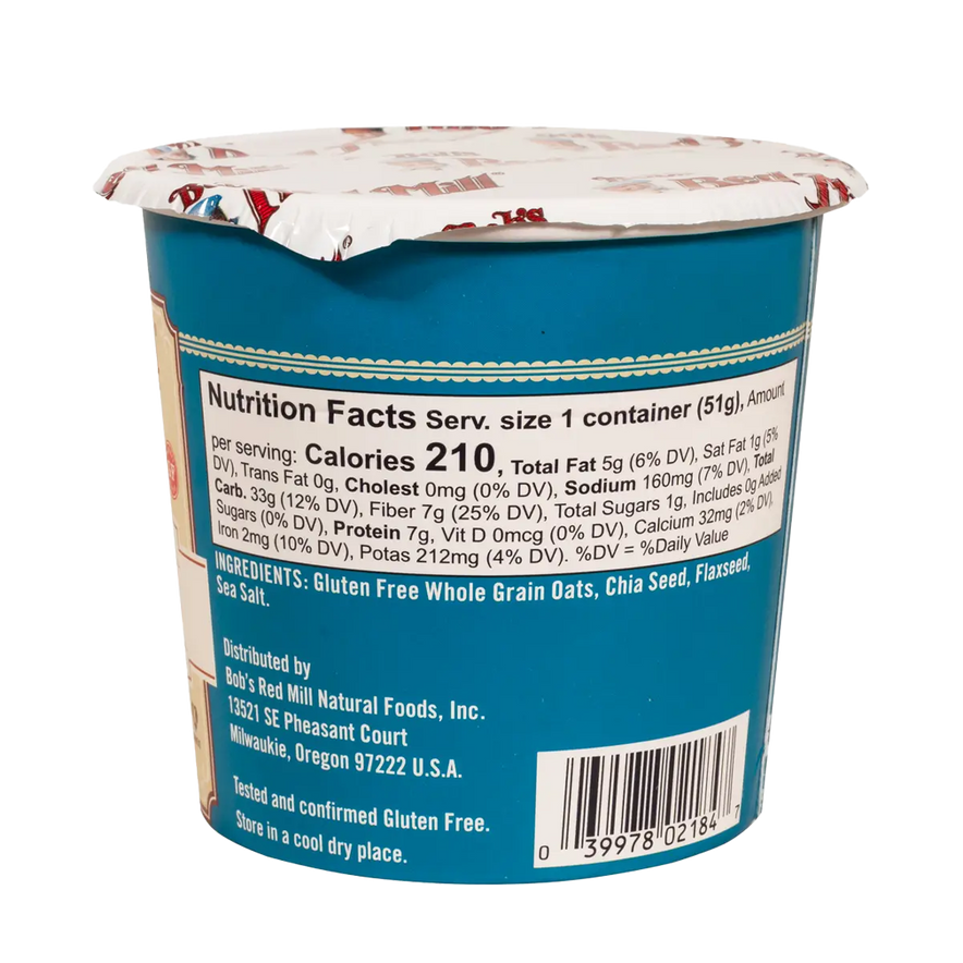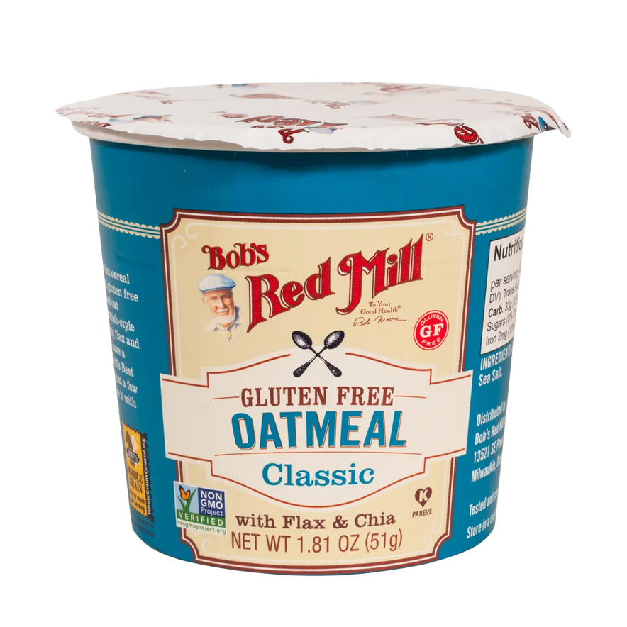 Bob’s Red Mill Classic Oatmeal Cup is a simple, wholesome blend of gluten free oats and chia seeds, perfect for a quick breakfast or snack you can customize your way. Portable and ready in just 3 minutes—simply add hot water or microwave—it’s milled, mixed, packaged, and tested in our dedicated gluten free facility for quality you can trust. Unflavored and unsweetened, it delivers 7g of protein, 7g of fiber, and a good source of iron, making it a nourishing blank canvas for your favorite add-ins like fresh fruit, nut butter, cinnamon, maple syrup, or brown sugar.