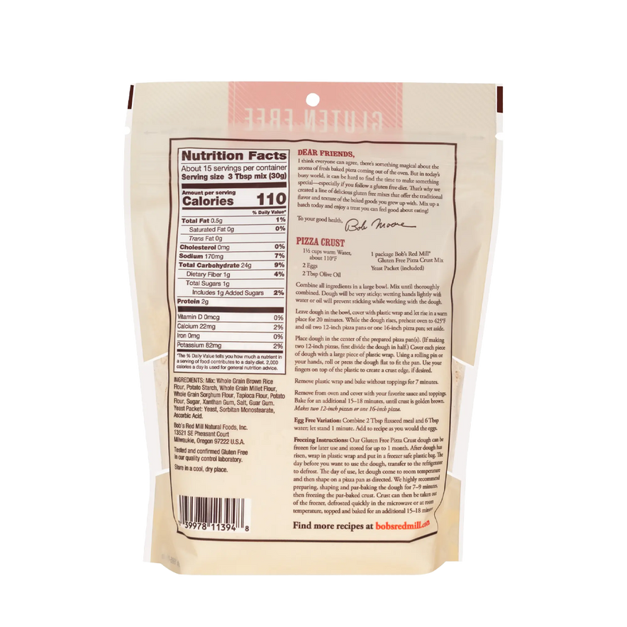 Bob’s Red Mill Gluten Free Pizza Crust Mix makes it easy to enjoy homemade, wheat-free, dairy-free, whole grain pizza that can even be prepared without eggs. Just add eggs, warm water, and olive oil (or substitutes), mix, and spread on an oiled pan for a crispy, chewy crust with authentic yeast flavor. The included yeast packet ensures great texture, and you can customize the dough with herbs like basil, oregano, garlic, or rosemary. Beyond pizza, this versatile mix is perfect for cheese breads, flatbreads, stromboli, naan, chapati, breadsticks, pretzels, cinnamon rolls, and even donuts—proving it’s a must-have for both savory and sweet creations.