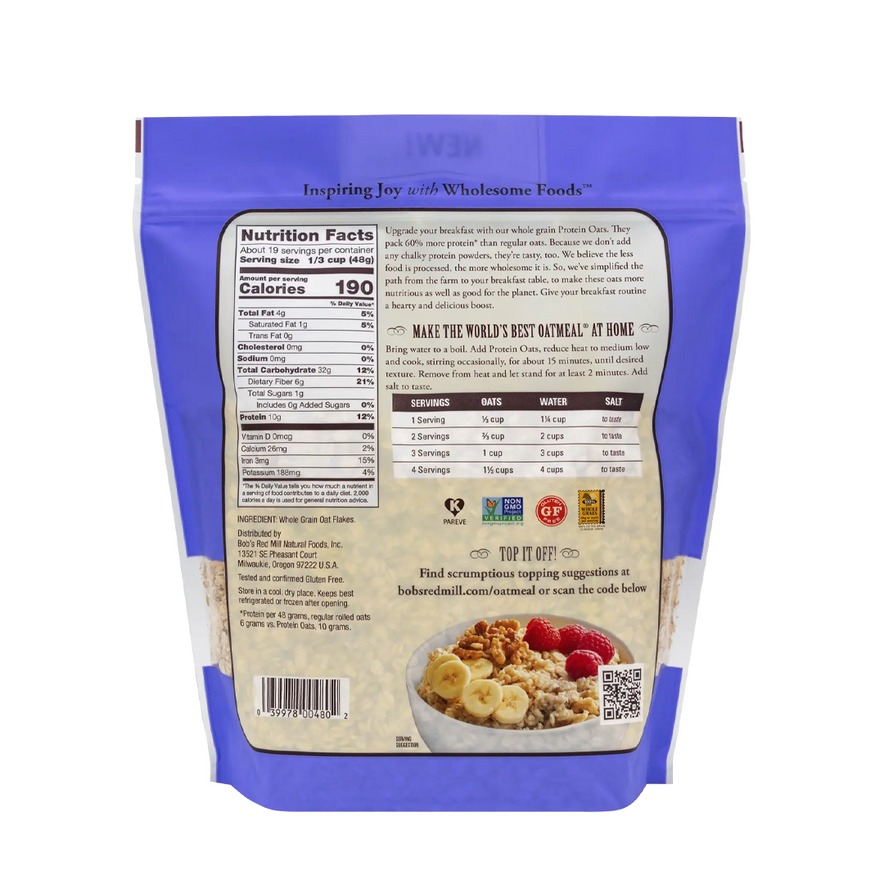Bob’s Red Mill Gluten Free Protein Oats offer a hearty, nourishing breakfast packed with plant-based protein and whole grain goodness. Made from high-quality gluten-free oats, these protein-rich oats provide a satisfying and energizing start to your day. Naturally wholesome and minimally processed, they’re perfect for classic oatmeal, overnight oats, or as a nutritious boost to baked goods and smoothies.