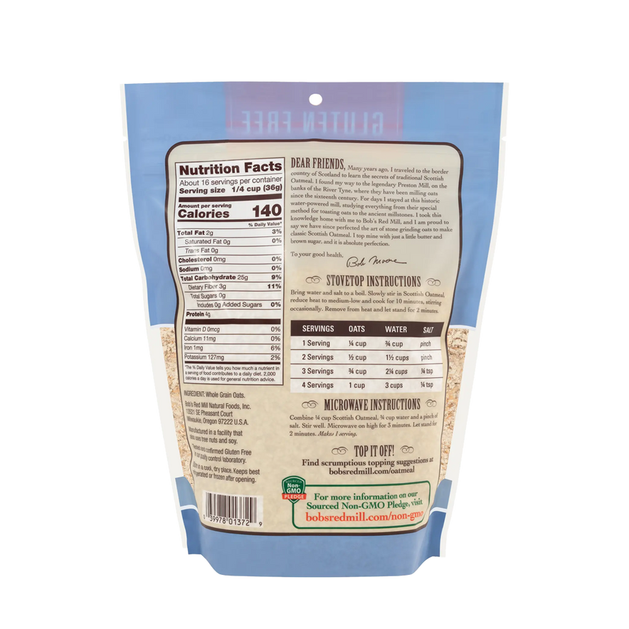 Bob's Red Mill Gluten Free Scottish Oatmeal offers a creamy, hearty, and uniquely smooth texture that sets it apart from traditional oats. Stone-ground the old-fashioned way, this oatmeal is made from whole grain gluten free oats that are milled into a fine meal, creating a porridge-style breakfast that’s rich in fiber and full of natural flavor. It’s an excellent choice for those who want a wholesome, satisfying start to their day.
