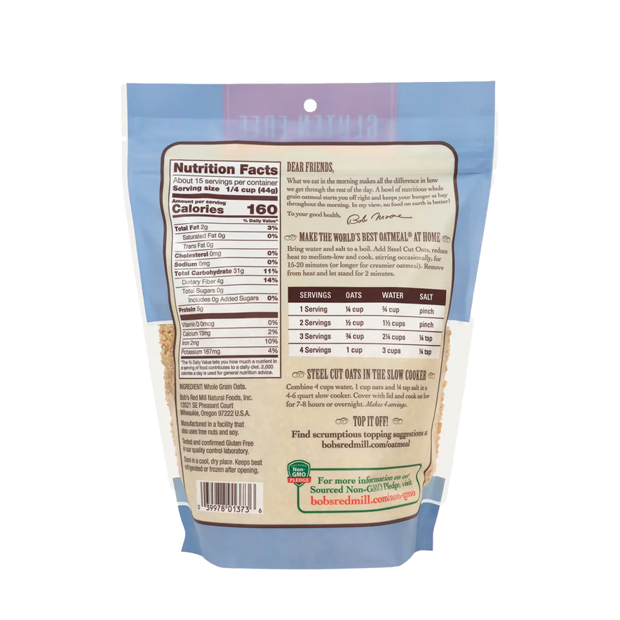 Bob's Red Mill Gluten Free Steel Cut Oats Whole Grain offer a hearty, chewy texture and rich, nutty flavor that makes them a favorite for a wholesome breakfast. Made from premium-quality whole grain oats and cut into neat pieces using traditional steel blades, these oats take a bit longer to cook but reward you with a truly satisfying bowl of oatmeal.