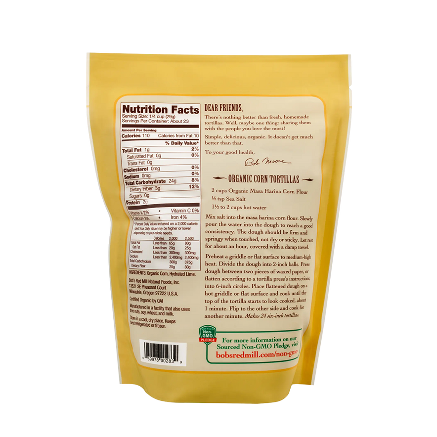 Bob’s Red Mill Golden Corn Flour Masa Harina is a flavorful flour made from nixtamalized corn—corn soaked in limewater for authentic taste and enhanced nutrition. Essential for homemade corn tortillas, tamales, pupusas, and arepas, this traditional Mesoamerican ingredient is crafted from hominy that’s cooked, soaked, and stone ground into masa, then dried into masa harina. Perfect for creating soft, flavorful dough with rich corn aroma and heritage.