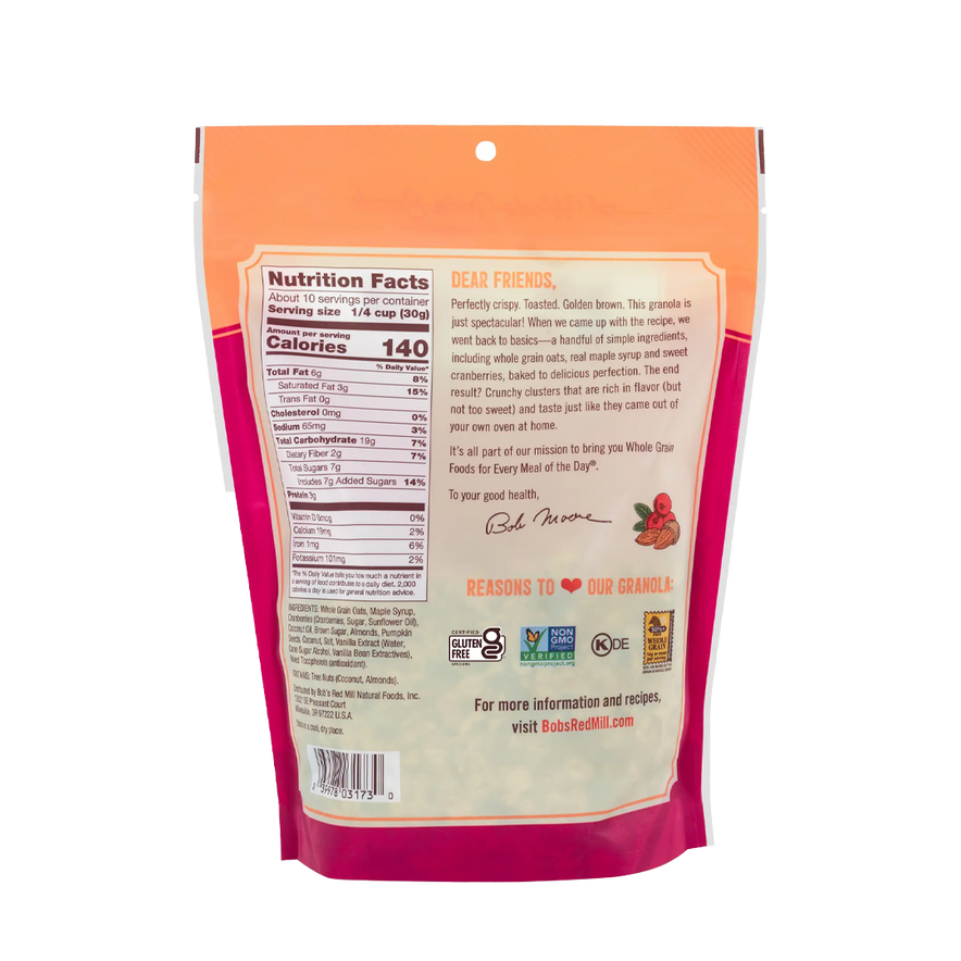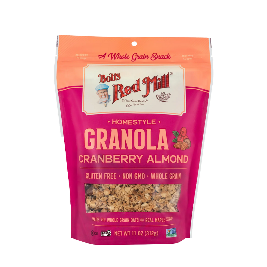 Bob’s Red Mill Cranberry Almond Homestyle Granola is a wholesome, pan-baked blend that tastes just like homemade, featuring whole grain oats, tart cranberries, and crunchy almonds. Certified gluten free and Non-GMO Project Verified, it’s made with simple, clean ingredients and contains 7 grams of sugar or less per serving. Perfect for breakfast or snacking, it delivers a satisfying crunch and balanced sweetness in every bite.
