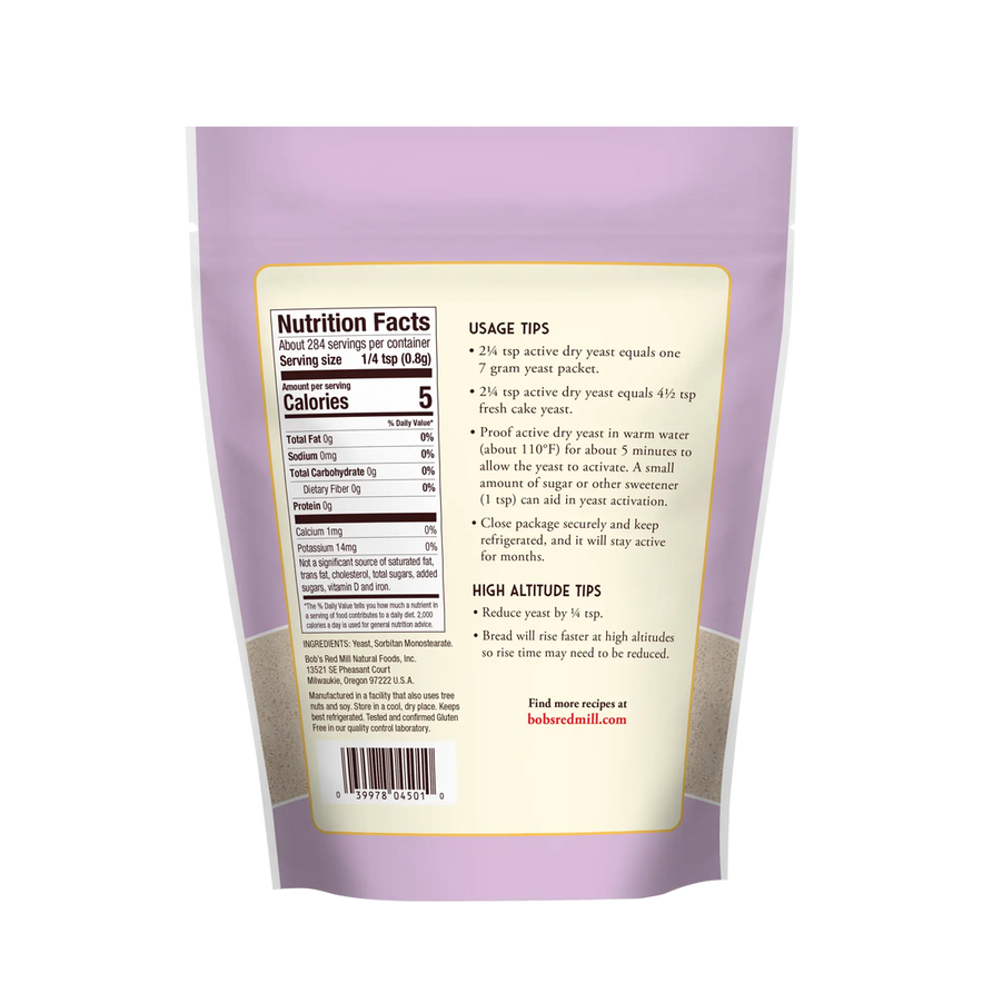Bob’s Red Mill Active Dry Yeast is fresh, reliable, and perfect for all your yeast-based baking needs. Ideal for sandwich bread, dinner rolls, artisan loaves, pizza crust, whole wheat bread, and cinnamon rolls, this gluten-free yeast delivers professional-quality results every time. Two and 1/4 teaspoons equal one standard 1/4-ounce packet, making it easy to measure for any recipe!