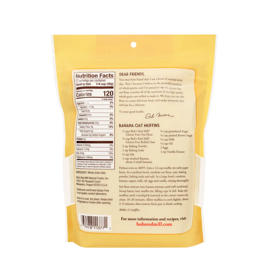 Bob’s Red Mill Whole Grain Oat Flour is freshly milled from pure whole grain oat groats—nothing added, nothing removed. With its subtle, sweet whole grain flavor, it’s perfect for adding nutrition and flavor to pancakes, muffins, breads, biscuits, and pie crusts, or for use as a thickener or breading. Replace up to 20% of the flour in your recipes for a boost of fiber, protein, and healthy fats, while enjoying the wholesome benefits of oats.