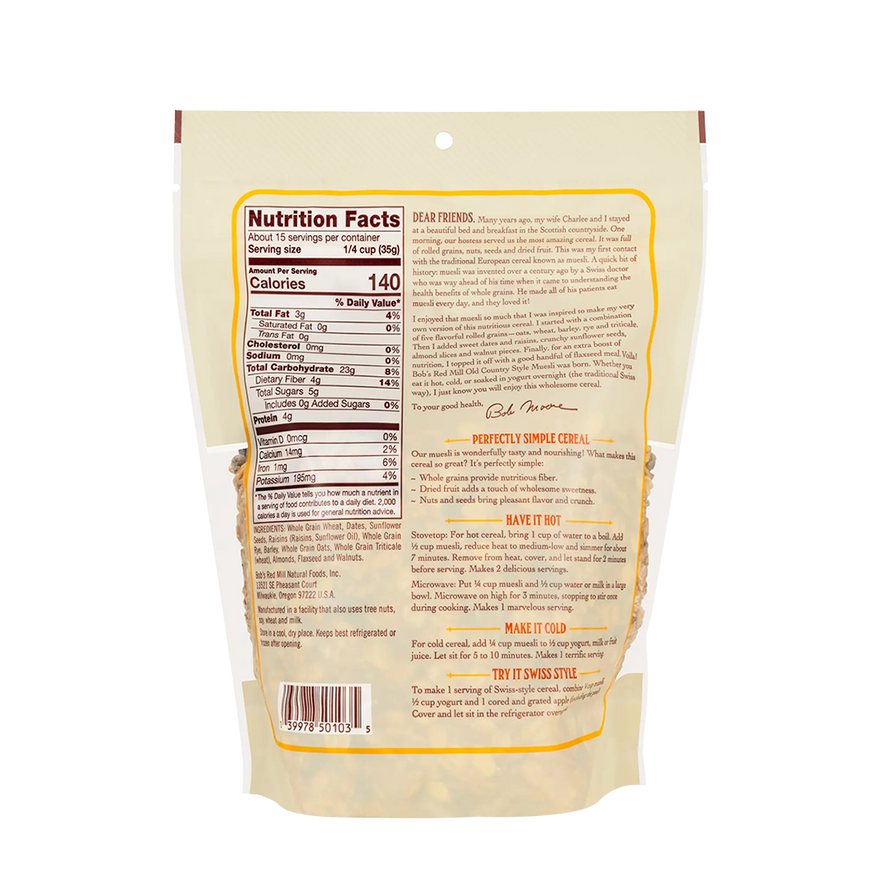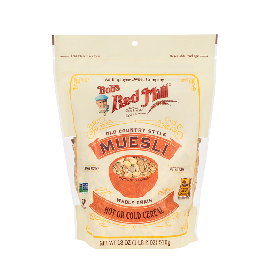Bob’s Red Mill Old Country Style Muesli is a traditional European-inspired cereal made with whole grain wheat, rolled oats, raisins, almonds, and walnuts. Enjoy it cold with milk, warm like oatmeal, or the Swiss way with yogurt and apple. Packed with hearty oats and wholesome ingredients, this muesli is a nutritious, high-energy alternative to sugary cereals—perfect for a satisfying breakfast any time.