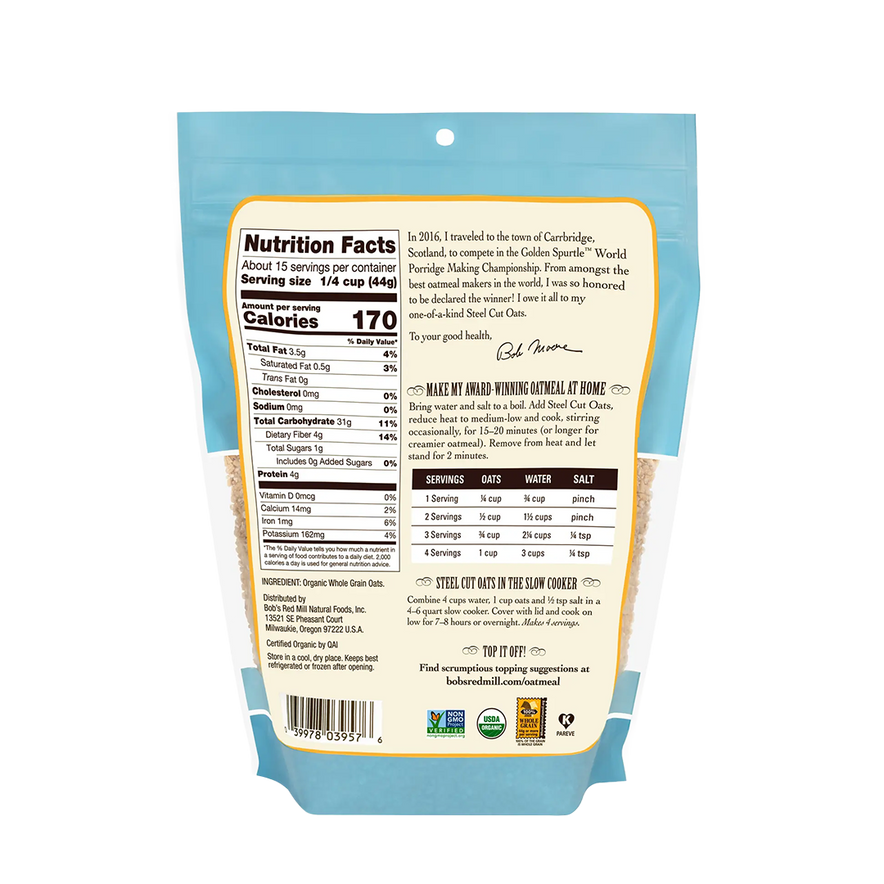 Bob’s Red Mill Steel Cut Oats are made from premium whole grain oat groats, cut into small pieces on a steel burr mill for a hearty, chewy texture. Also known as Irish or pinhead oats, they’re lightly toasted for rich flavor and can be enjoyed as a warm breakfast cereal or in savory dishes like risotto. A good source of fiber and protein, these wholesome oats are a filling, nutritious way to start your day.