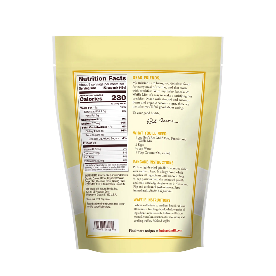 Bob’s Red Mill Paleo Pancake & Waffle Mix makes it simple to enjoy fluffy, golden, grain-free pancakes and waffles at home. Crafted with almond flour, coconut flour, root starches, and organic coconut sugar, this gluten-free, paleo-friendly mix delivers amazing texture and flavor. Just add eggs, water, and coconut oil for a wholesome breakfast or snack—perfect with grass-fed butter and pure maple syrup.