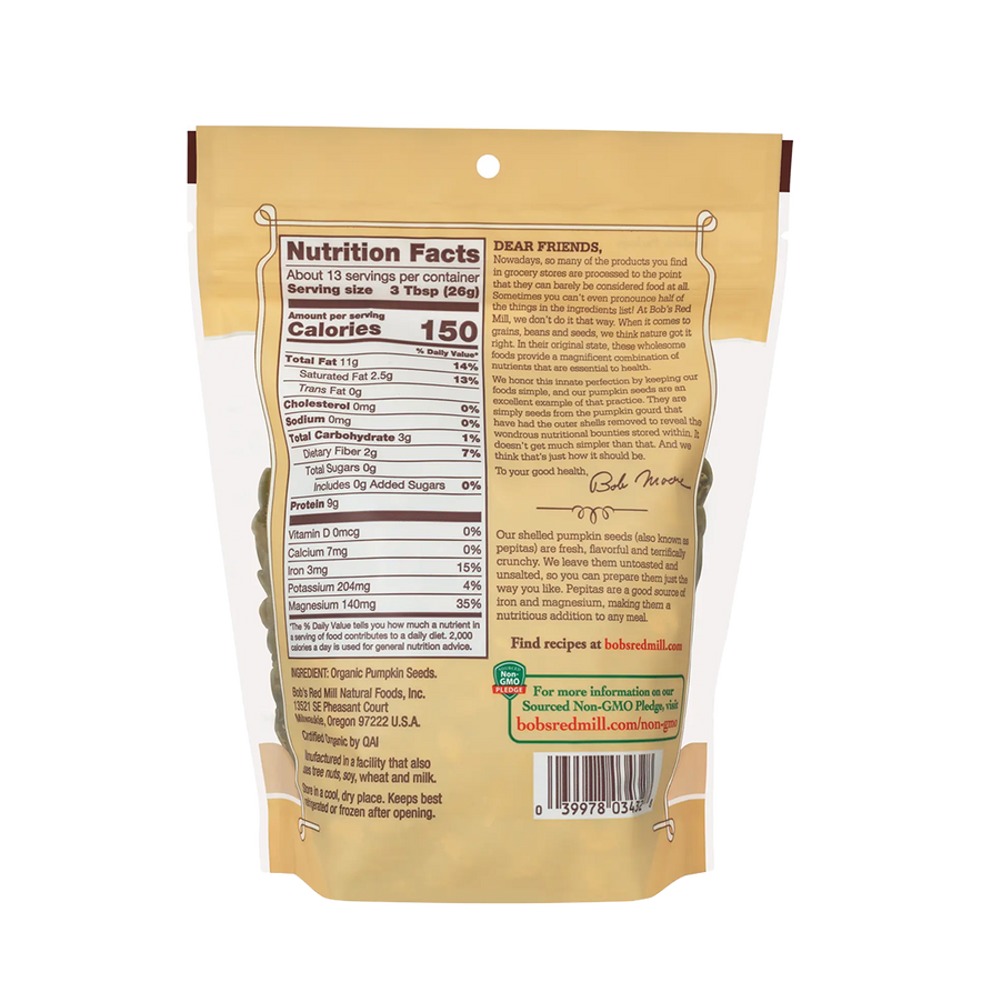 Bob’s Red Mill Pumpkin Seeds (Pepitas) are nutrient-rich, plant-based powerhouses with a delicately nutty flavor perfect for both sweet and savory dishes. Long treasured in Mexican cuisine, these raw pepitas can be enjoyed straight from the bag, roasted for extra crunch, or blended into pumpkin seed butter and dairy-free milk. Packed with magnesium, iron, zinc, potassium, antioxidants, and essential fatty acids—including omega-3 and omega-6—they also provide 9g of plant-based protein per 3-tablespoon serving. Versatile and wholesome, they add flavor, texture, and nutrition to cereals, salads, granola, baked goods, and snacks while supporting heart health, healthy blood pressure, and overall wellness.