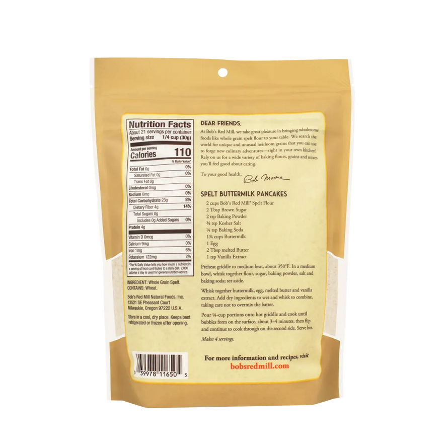 ob’s Red Mill Spelt Flour is 100% stone ground from a wholesome ancient grain related to modern wheat. It has a mild, nutty-sweet flavor and a light texture, making it ideal for bread, cookies, muffins, waffles, and homemade pasta without the heaviness of other whole wheat flours. A good source of fiber and protein, spelt flour can be used to replace 25–50% of all-purpose or whole wheat flour in your favorite recipes for tender, flavorful baked goods. Contains gluten and is prized by many for its potential easier digestibility compared to common wheat.