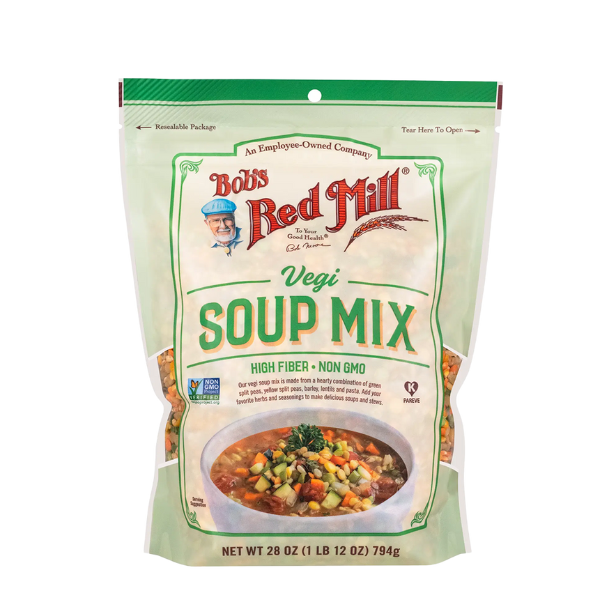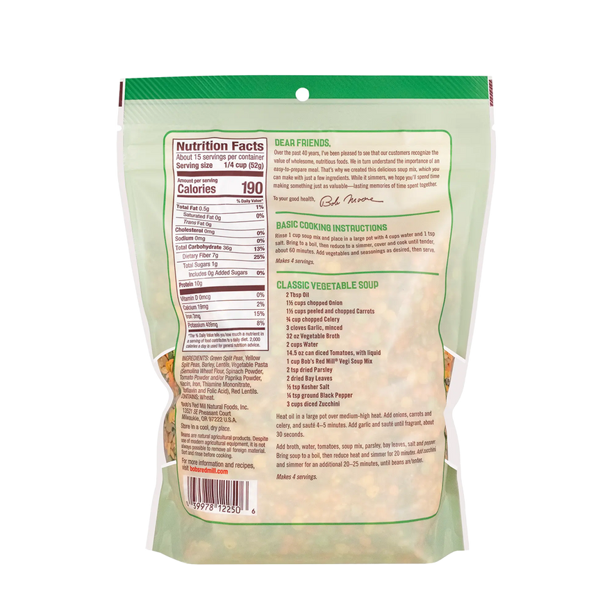 Bob’s Red Mill Vegi Soup Mix is a hearty blend of green and yellow split peas, barley, lentils, and colorful alphabet vegetable pasta made with wheat flour, spinach, and tomato. As it cooks, the peas and lentils soften to create a thick, satisfying texture perfect for a wholesome, meatless meal. Enjoy it as-is for a fiber-rich soup, or customize with vegetable broth, fresh vegetables, and a splash of cream for a delicious twist. For extra smoothness, puree before serving.