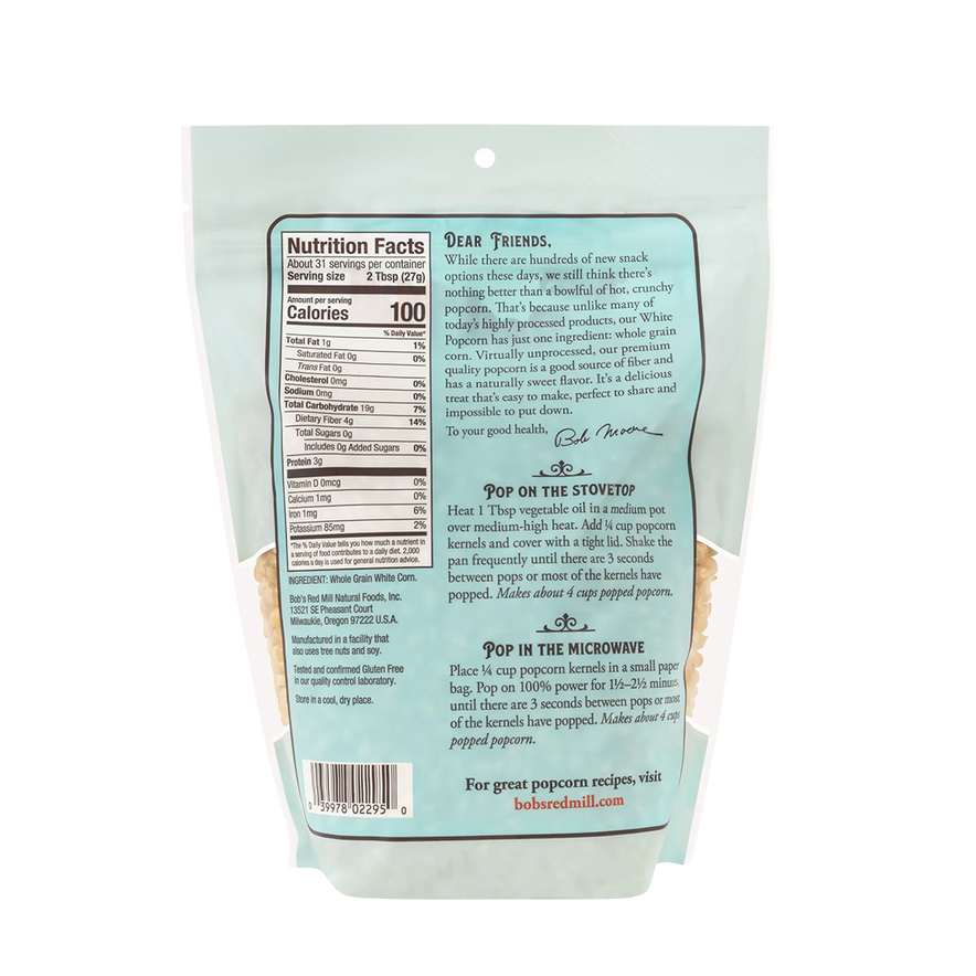 Bob’s Red Mill Whole White Popcorn pops into tender, fluffy kernels with a sweet, delicious flavor that will make you forget packaged microwave popcorn. Carefully selected from the finest corn crops and dried to the perfect moisture level, these premium kernels deliver a light crunch and movie-theater-worthy taste whether air-popped, stove-popped, or microwaved. Naturally low in fat, rich in fiber, and free from saturated and trans fats, they’re a wholesome snack you can customize with your favorite herbs, spices, oils, or sweet toppings. Perfect for everyday snacking, movie nights, or creative treats, this is popcorn at its very best.