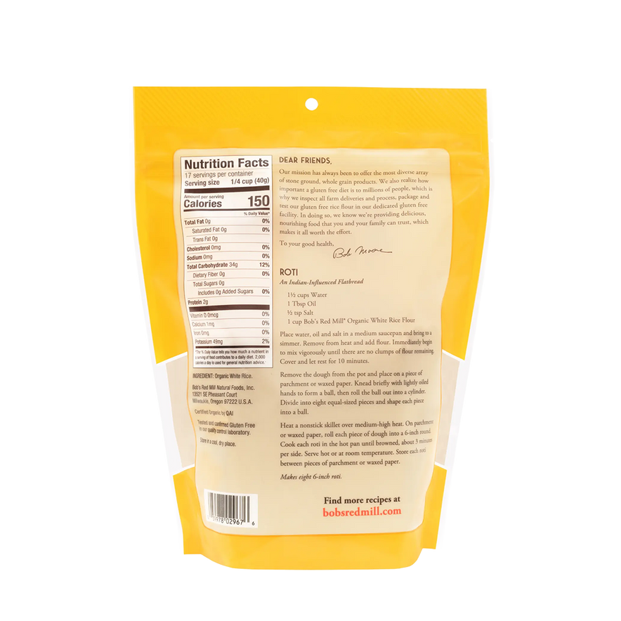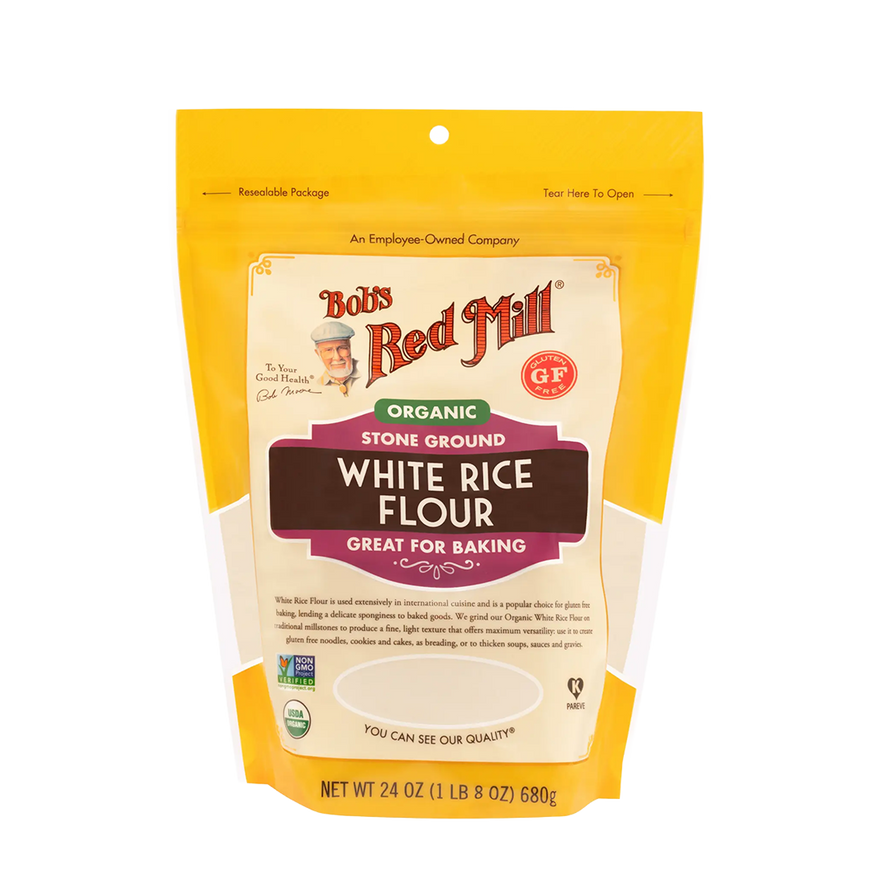 Bob’s Red Mill Organic White Rice Flour is 100% stone ground from premium white rice for exceptional quality. Ideal for gluten-free baking and as a thickening agent in sauces and gravies, this versatile flour is made from high-quality grain and has a two-year shelf life.