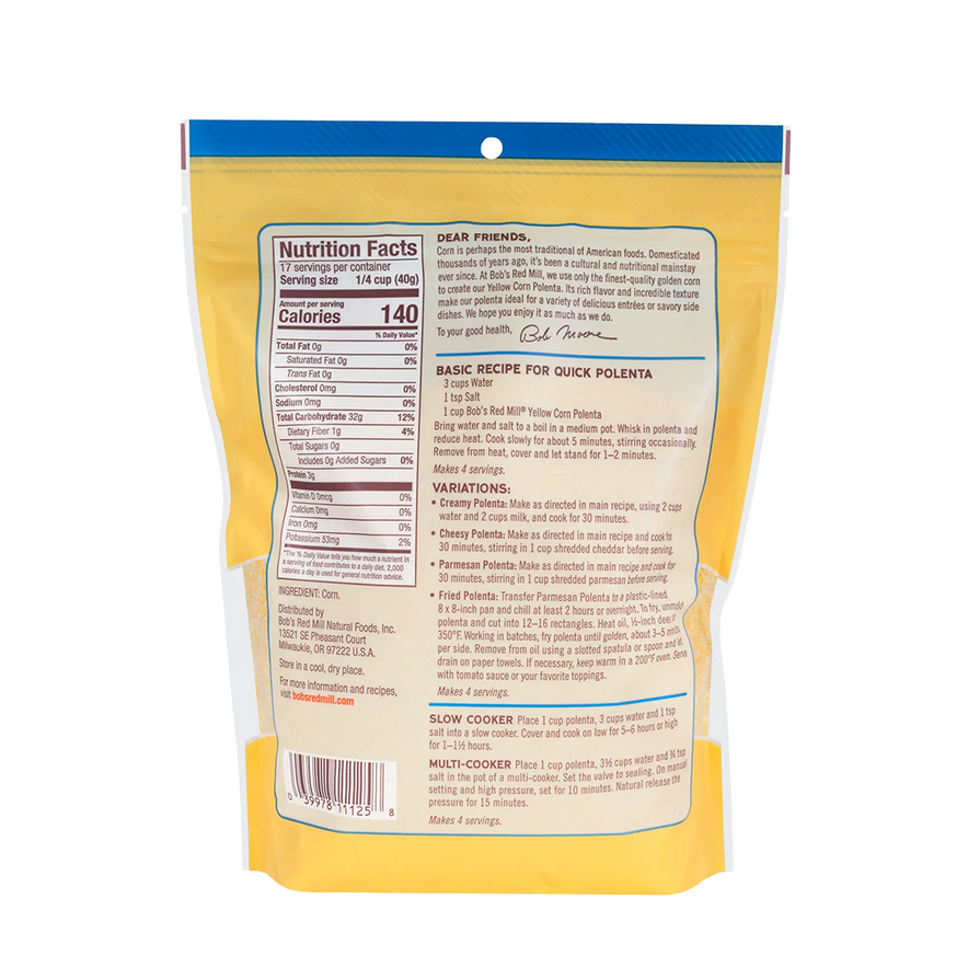 Bob’s Red Mill Yellow Corn Polenta is made from the highest quality yellow corn, traditionally ground from dried kernels for authentic flavor and texture. Perfect for creating gourmet Italian and Mediterranean dishes, it can be served creamy with savory toppings like goat cheese and sun-dried tomatoes or enjoyed as a comforting hot cereal with milk, honey, fruit, and spices. Versatile and delicious, it’s a pantry staple for both sweet and savory recipes.