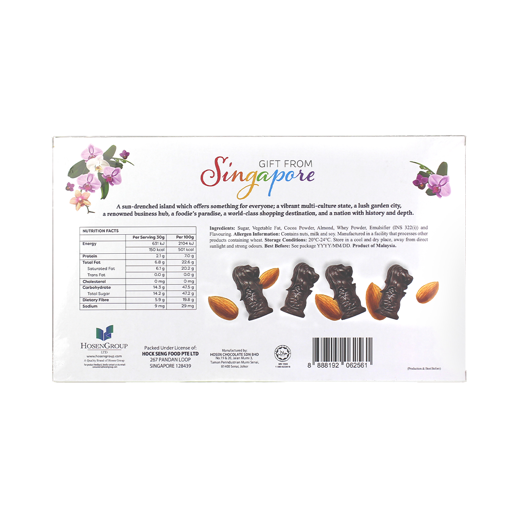Calbuco Dark Chocolate Almond Nut Merlion 120g features roasted almond nuts enveloped in rich dark chocolate, crafted into the shape of Singapore's iconic Merlion. With bold cocoa flavour and nutty crunch, it's a premium indulgence perfect for gifting, sharing, or enjoying as a memento.