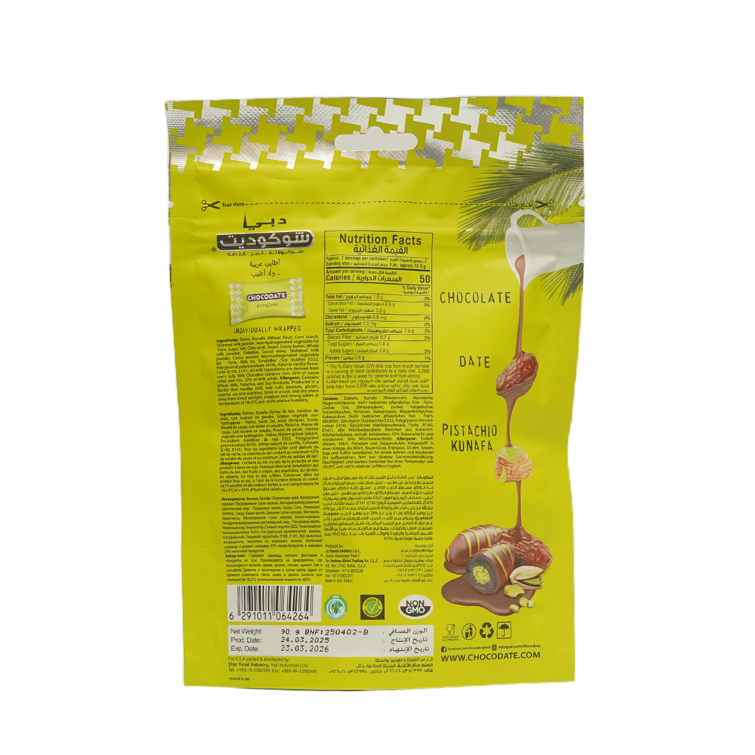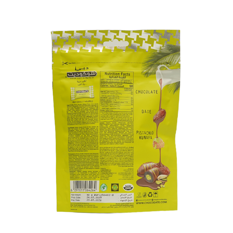 Dates (41%), Milk Chocolate (26%) [Sugar, Whole Milk Powder, Cocoa Butter, Cocoa Mass, Lactose (Milk), Whey Powder (Milk), Emulsifier (Soy Lecithin), Natural Vanilla Flavor], Kunafa (17%) [Wheat Flour (Gluten), Corn Starch, Salt], Vegetable Fat, Pistachios (6%), Sugar, Sunflower Oil.