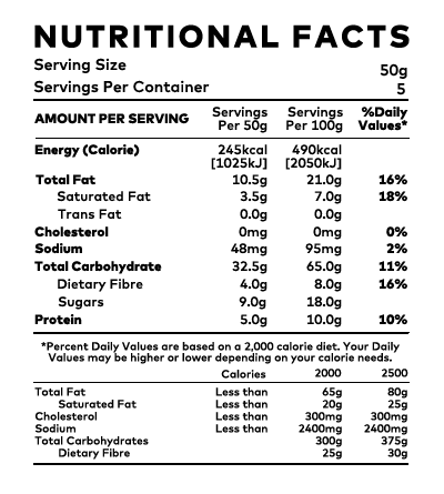 Rolled oats, coconut flakes, sugar, coconut oil, kaya flavour, honey.