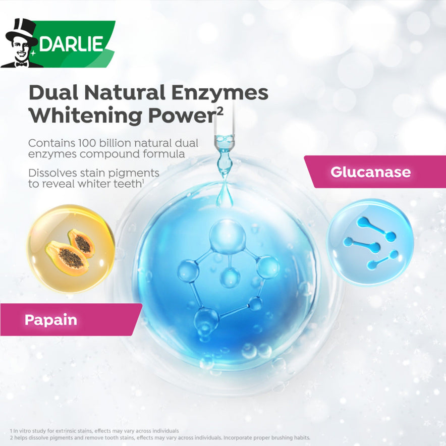 DARLIE All Shiny White Supreme Enzyme Toothpaste contains natural enzyme compound formula with Papain enzyme and Glucanese enzyme. Papain enzyms hydrolyzes the protein layer and adhesive stain from saliva and dental plaque. Glucanese enzyme dissolves the glucan from dental plaque. This dual enzyme technology* drives 5X stain dissolvability power^ to whiten and brighten teeth. It covers the teeth and forms a high density protective shield to prevent stain build-up*^. Floral mint flavor provides a light floral aroma for a delighting sensation.