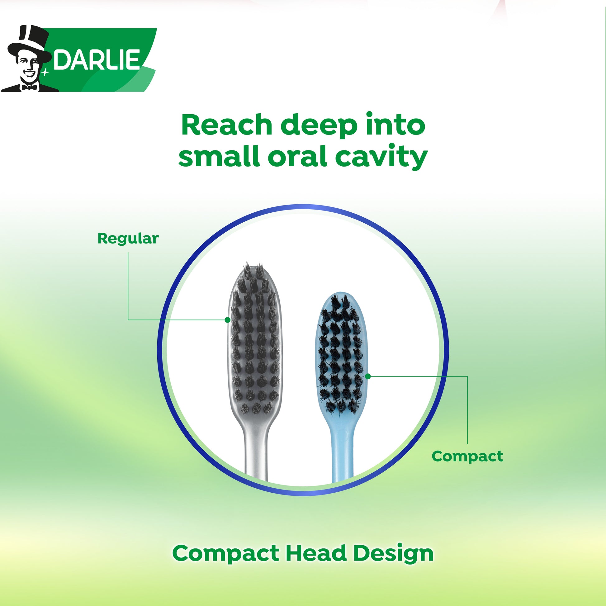 DARLIE Charcoal Clean Regular Toothbrush bristles contain binchotan charcoal particles clean your teeth well to get rid of bad breath. Its soft and 0.01mm^ slim tip bristles reach deeper between teeth for better cleansing. The Charcoal infused bristles effectively reduce bacterial growth on bristle by 99%. Dentists advise changing your toothbrushes every 3 months and brush at Ieast twice a day for 2-3 minutes!