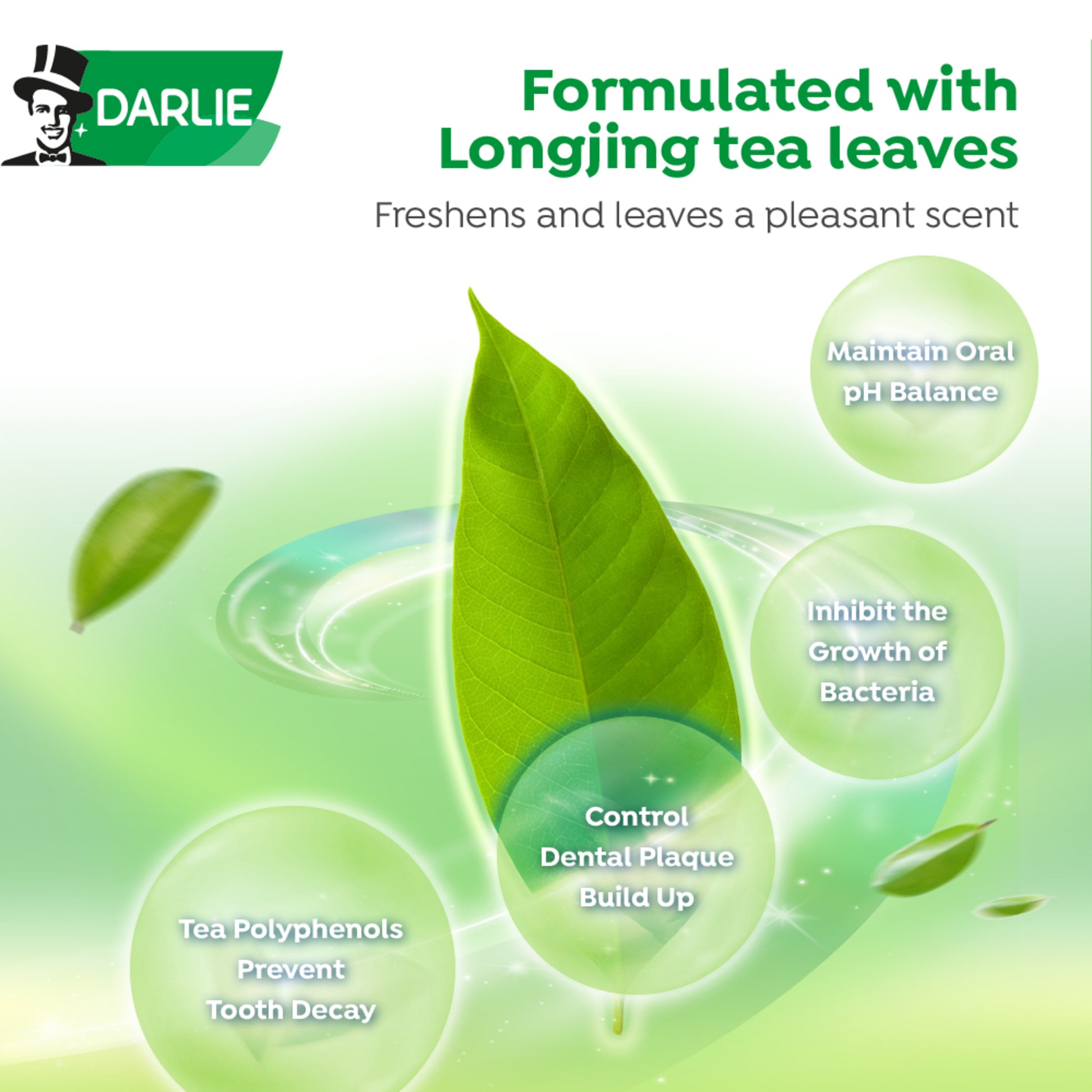Darlie Tea Care Green Tea contains accredited organic Longjing tea leaves, allowing you to start the day with a fresh taste and lingering aroma of green tea. It contains tea polyphenol and fluoride to prevent cavities and truly protect oral health. Natural tea aroma fills your mouth with lasting freshness when you brush your teeth.