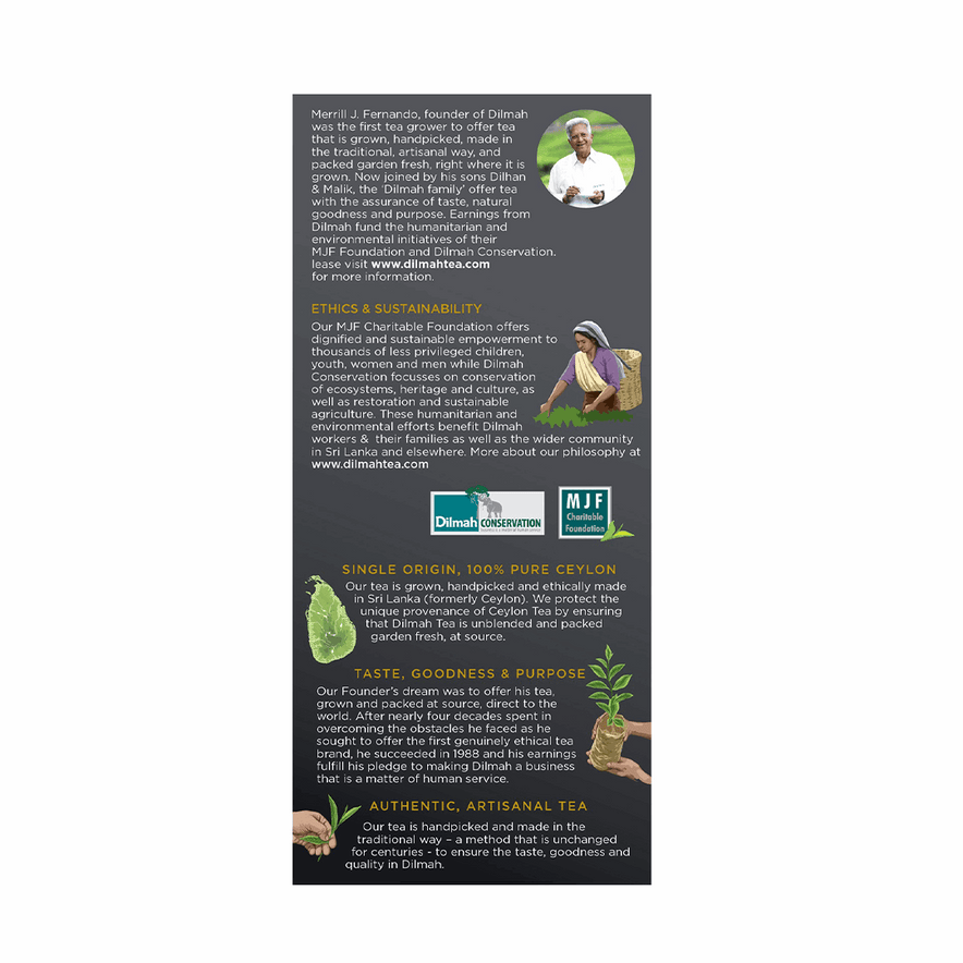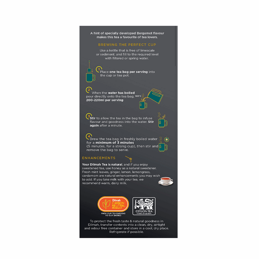Experience sophistication in every sip with Dilmah Earl Grey Tea, a classic Ceylon black tea infused with natural bergamot essence. This elegant blend offers a refreshing citrus aroma and a smooth, refined taste - perfect for afternoon tea.