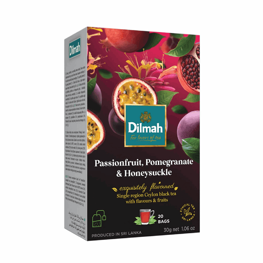 Indulge in the exotic blend of Dilmah Passionfruit & Honeysuckle Tea, combining premium Ceylon black tea with tropical passionfruit and floral honeysuckle notes. A vibrant, aromatic tea ideal for hot or iced preparation.