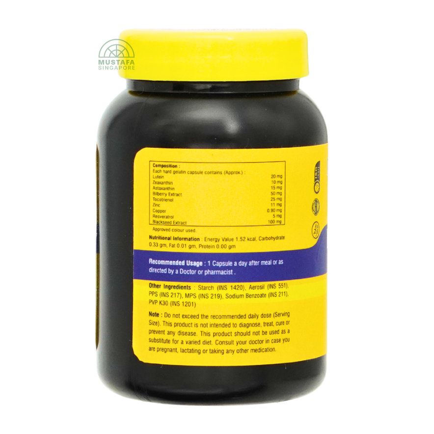 Lutein, Zeaxanthin, Astaxanthin, Bilberry Extract, Tocotrienol, Zinc, Copper, Resveratrol, Blackseed Extract. Starch (INS 1420), Aerosil (INS 551), PPS (INS 217), MPS (INS 219), Sodium Benzoate (INS 211), PVP K30 (INS 1201)