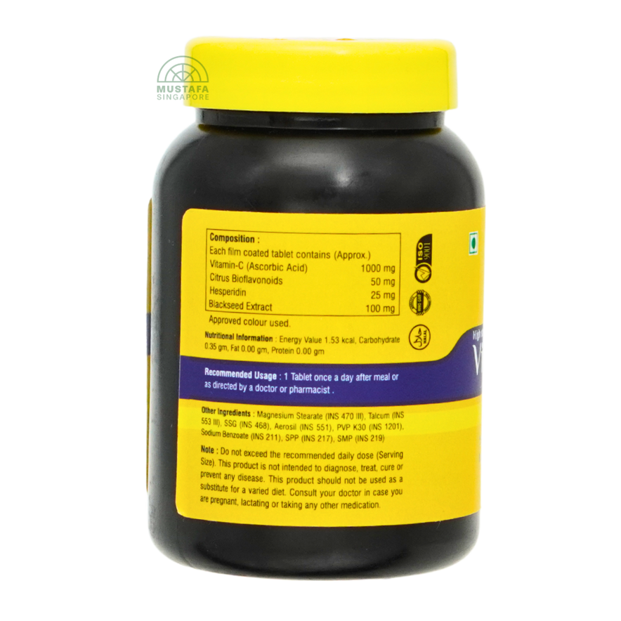 Vitamin C (Ascorbic Acid), Citrus Bioflavonoids, Hesperidin, Blackseed Extract. Magnesium Stearate (INS 470 III), Talcum (INS 553 III), SSG (INS 468), Aerosil (INS 551), PVP K30 (INS 1201), Sodium Benzoate (INS 211), SPP (INS 217), SMP (INS 219)