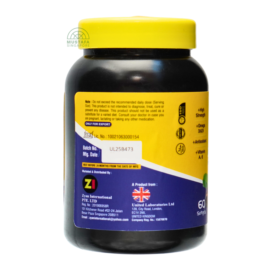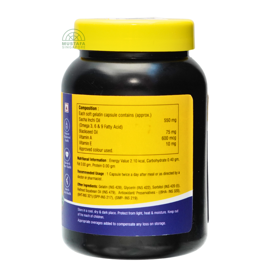 Sacha Inchi Oil (Omega 3, 6 & 9 Fatty Acid), Blackseed Oil, Vitamin A, Vitamin E. Gelatin (INS 428), Glycerin (INS 422), Sorbitol (INS 420 (I)), Refined Soyabean Oil (INS 479), Antioxidant/Preservatives - ((BHA - INS 320). (BHT-INS 321)/(SPP-INS 217), (SMP - INS 219)