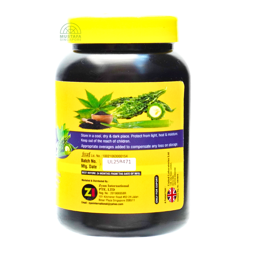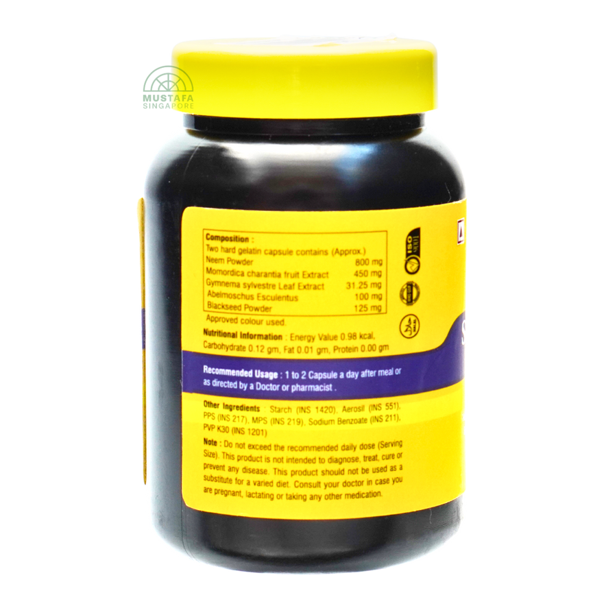 Neem Powder, Momordica charantia fruit extract, Gymnema sylvestre leaf extract, Abelmoschus esculentus, and Blackseed Powder. Sarch, aerosil, PPS, MPS, sodium benzoate, and PVP K30.
