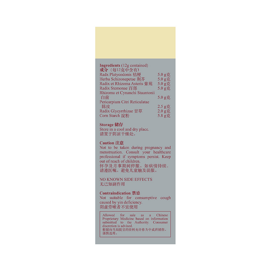 Herbal Extracts (Fritillaria, Platycodon, Licorice), Sugar, Glucose.