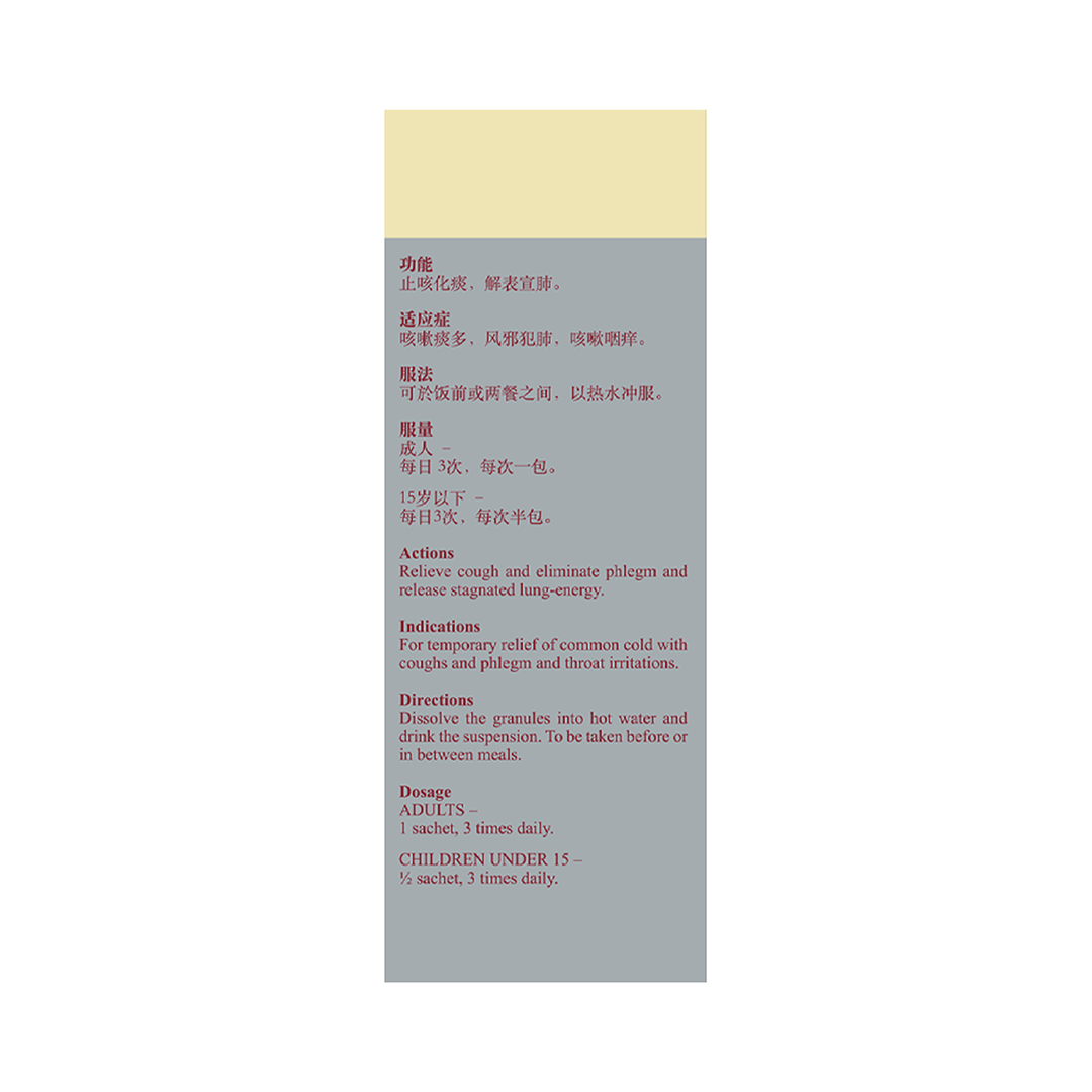 Eu Yan Sang Cough Relief Granules are formulated with traditional herbs used to soothe throat irritation, reduce coughing, and clear phlegm caused by heatiness or dryness. The fast-dissolving granules make it easy to consume anytime for quick relief and throat comfort.