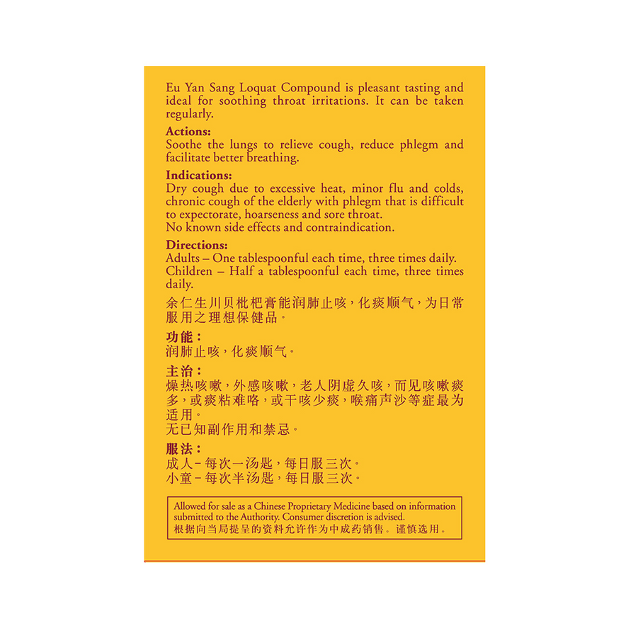 Loquat Compound provides soothing relief for throat discomfort with a blend of loquat leaf extract, herbs, and honey. It helps reduce dryness, irritation, and mild cough symptoms while refreshing the throat.