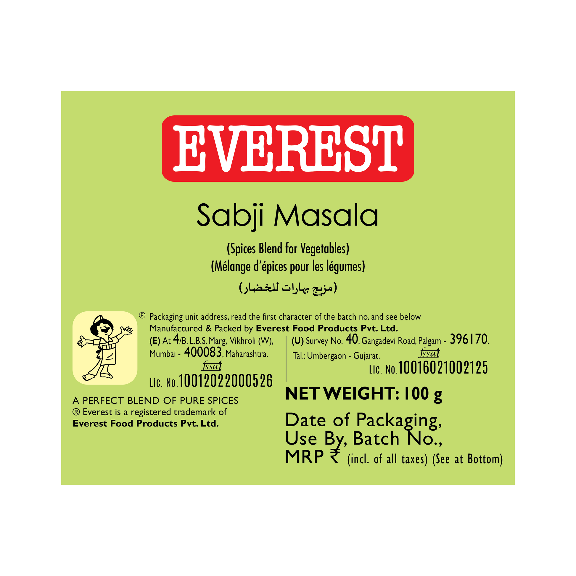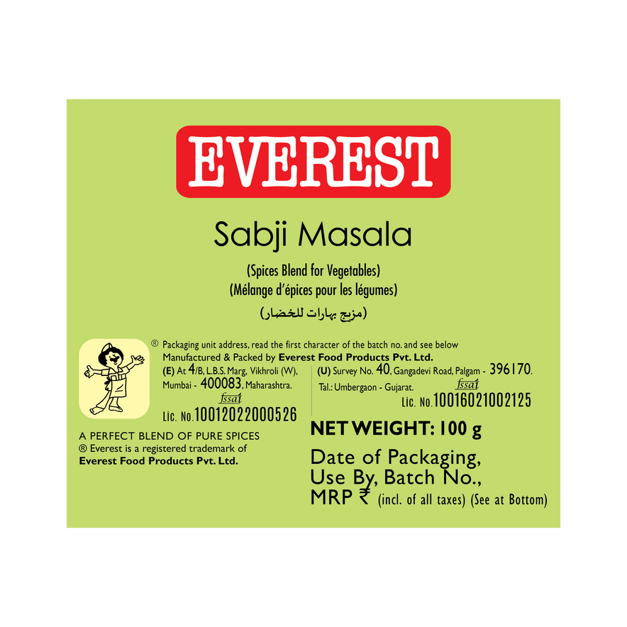 Elevate your vegetable dishes with Everest Sabji Masala, a premium blend of aromatic spices that enhances the taste and color of your curries. Crafted to perfection, this masala transforms everyday vegetables into flavorful delights, perfect for quick and delicious meals. Whether you're preparing a traditional sabji or experimenting with new recipes, Everest Sabji Masala adds an authentic touch to your cooking.