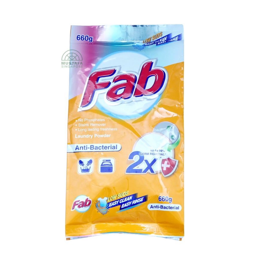 Protect your laundry with hygienic cleaning power using FAB Laundry Powder Anti Bacterial 660g. Specially designed to fight stains, dirt, and bacteria, this detergent leaves clothes feeling fresh, safe, and comfortable against the skin. Perfect for activewear, towels, and children's clothing, it ensures every wash delivers deep cleanliness and odor protection. Compact and practical, it works effectively in both front load and top load machines for consistently fresh results.