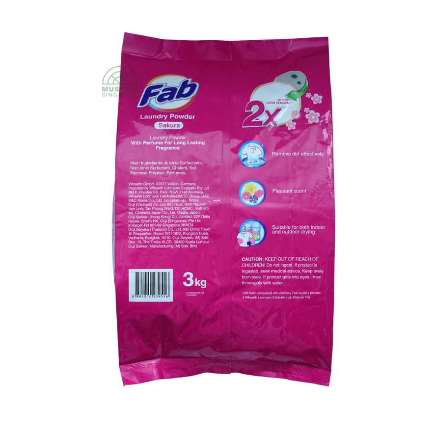 Bring the fragrance of spring blossoms into your laundry routine with FAB Laundry Powder Sakura 3kg. Its strong cleaning action removes stubborn stains while leaving fabrics soft, fresh, and infused with the delicate aroma of sakura. Perfect for families and frequent washing, this larger pack ensures lasting value and long-term freshness for your clothes. Compatible with all machine types, it provides dependable performance with every wash.