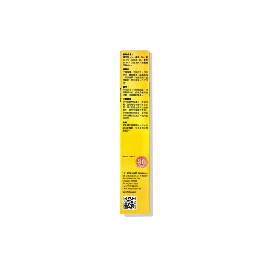 Menthol 4%, Camphor 5%, Ginger Oil 8%, Turpentine Oil 9%, Citronella Oil 8%, White Oil 28%, Capsicum Oleoresin 8%.
