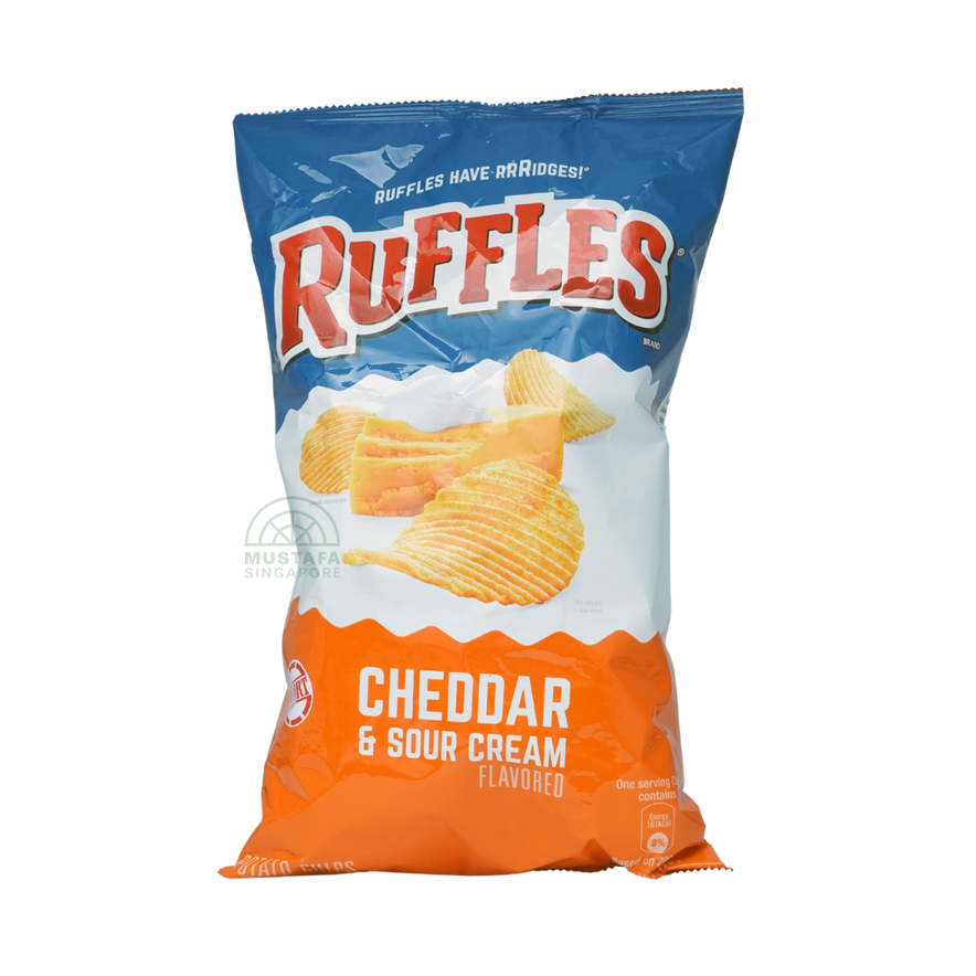 Ruffles Cheddar & Sour Cream Potato Chips combine the creamy tang of sour cream with bold cheddar cheese flavor, layered on thick, ridged chips. Every bite delivers rich, cheesy goodness and a hearty crunch that satisfies your snack cravings.