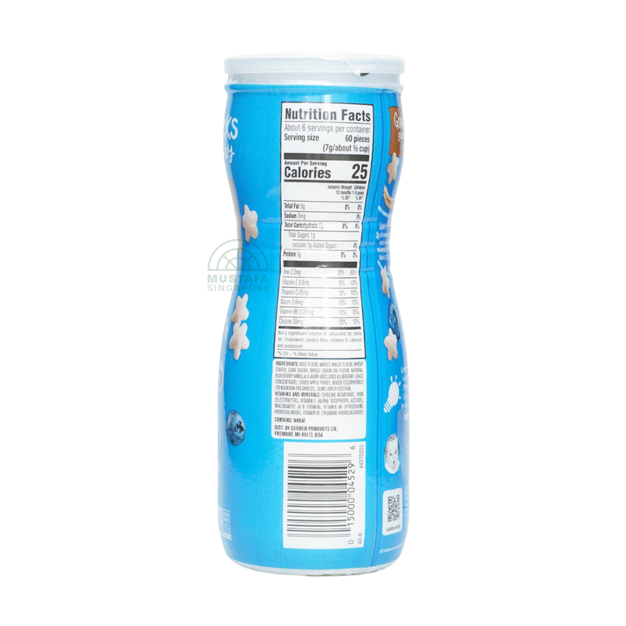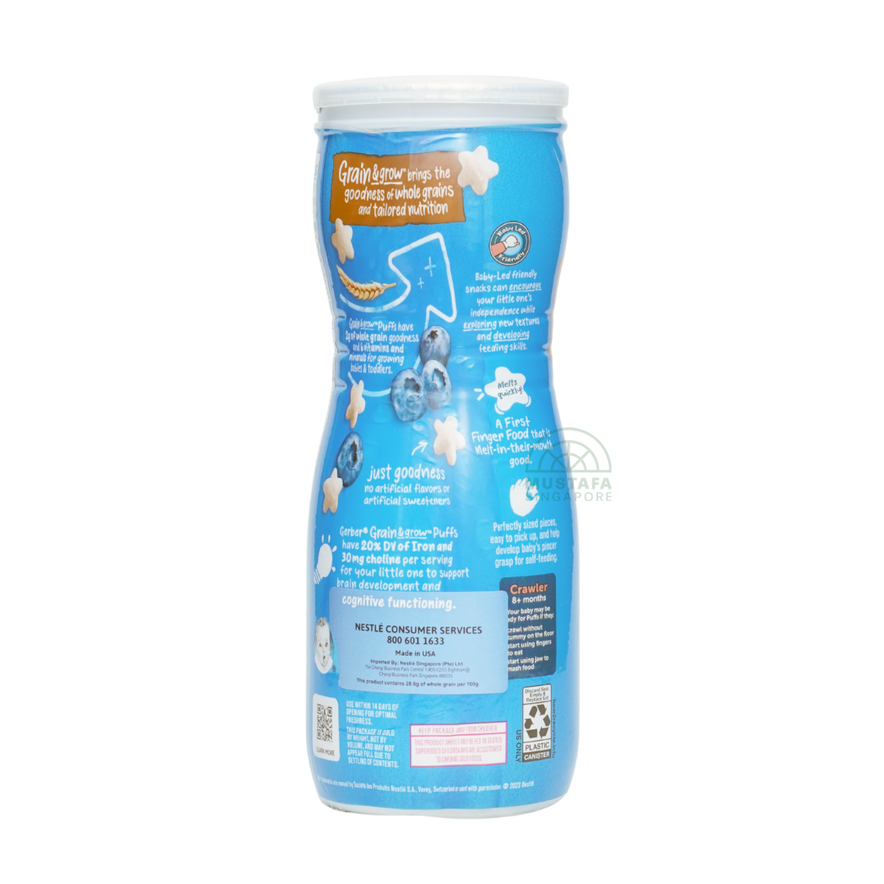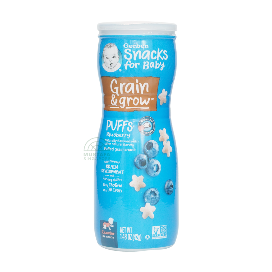 Gerber Snacks for Baby Grain & Grow Puffs Blueberry 42g are nutritious, melt-in-the-mouth puffs made with real blueberry and grains. Suitable for babies from 8 months onwards, they support growth and sensory development.